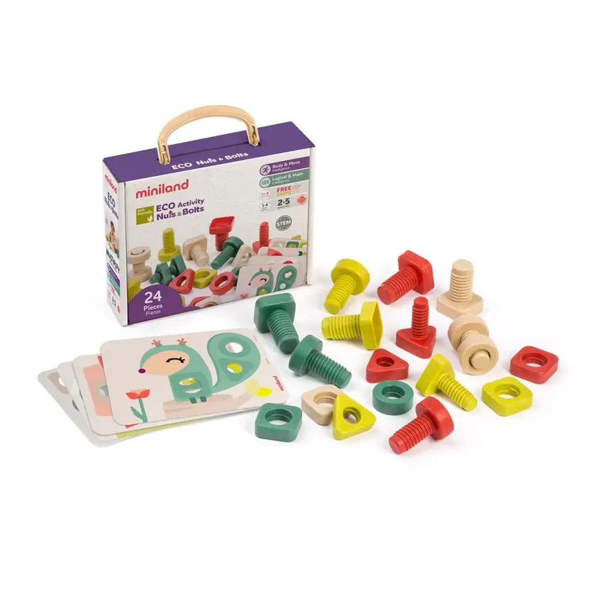 Potiču razvoj koordinacije oko-ruka i fine motorike kroz radnju zavrtanja i odvijanja. Vijci i matice su izdržljivi i vrlo otporni, a izrađeni su od ekološki prihvatljivih materijala koji smanjuju utjecaj na okoliš.