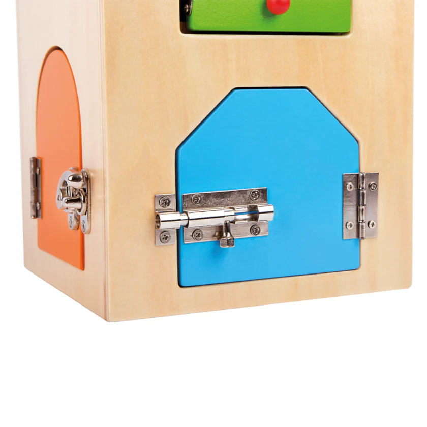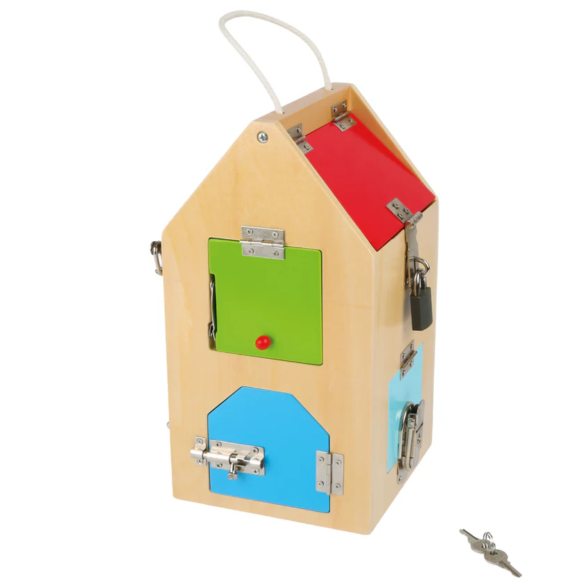 Drvena kućica s bravicama 🔐 savršen je alat za razvoj fine motorike, logičkog razmišljanja i svakodnevnih vještina. Djeca kroz igru otvaraju i zatvaraju bravice, lokote, zasune i poluge te uče praktične životne vještine na zabavan način ✨