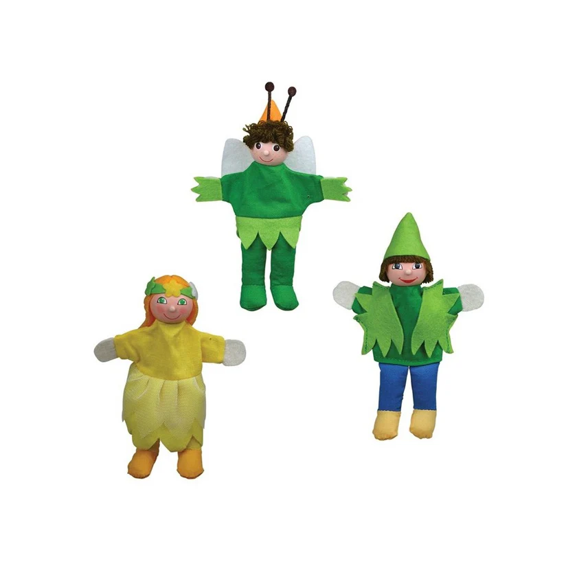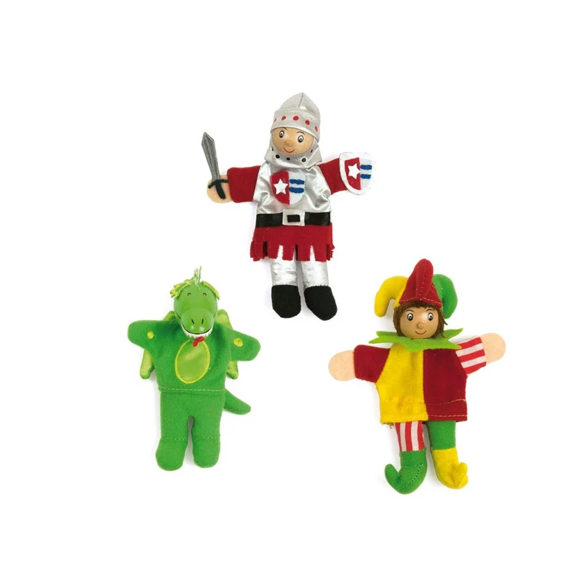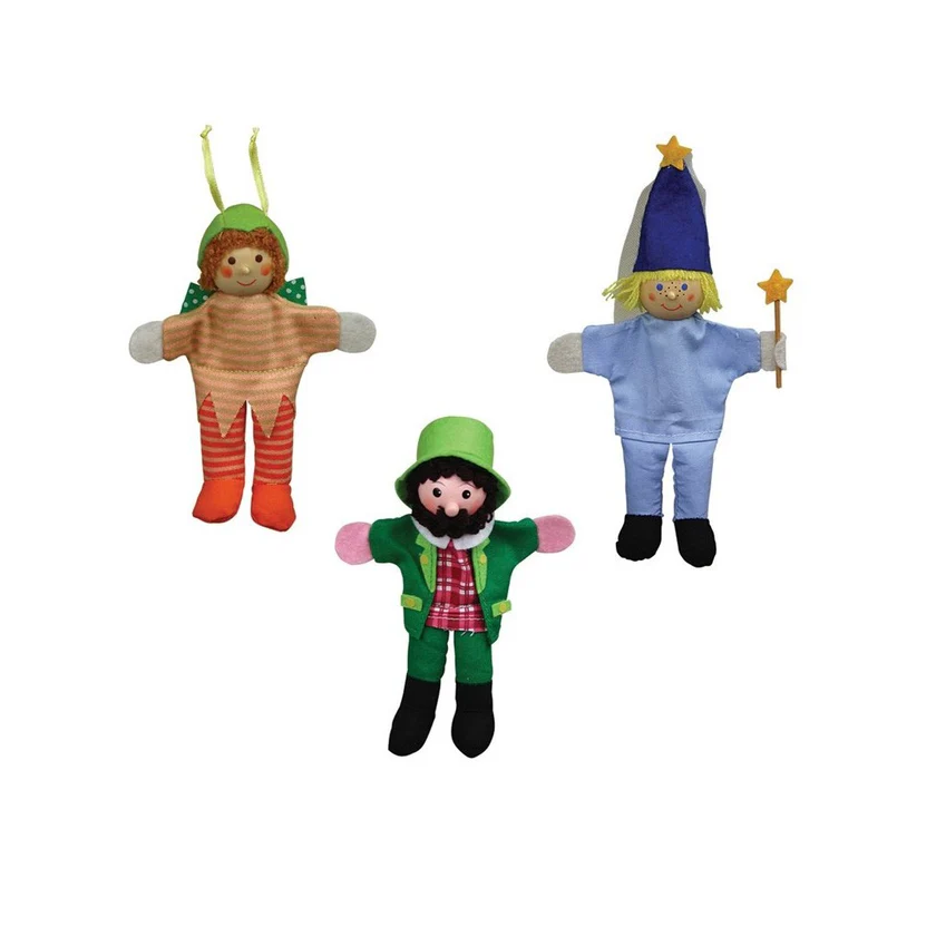 Set sadrži 12 lutkica za prste, izrađenih od kombinacije drva i sintetičkih materijala, prilagođenih malim rukama.