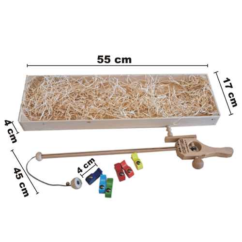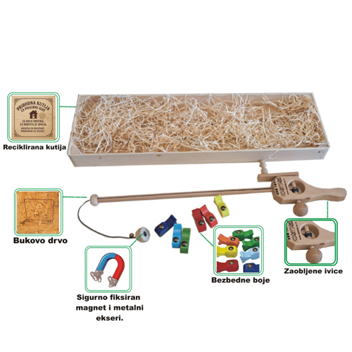Edukativna drvena igračka namijenjena djeci 3+ godina, osmišljena za razvoj osnovnih motoričkih i kognitivnih vještina. U drvenoj kutiji nalazi se komplet ribica i pecaljka sa magnetom, izrađena od pažljivo obrađenog tvrdog drveta.