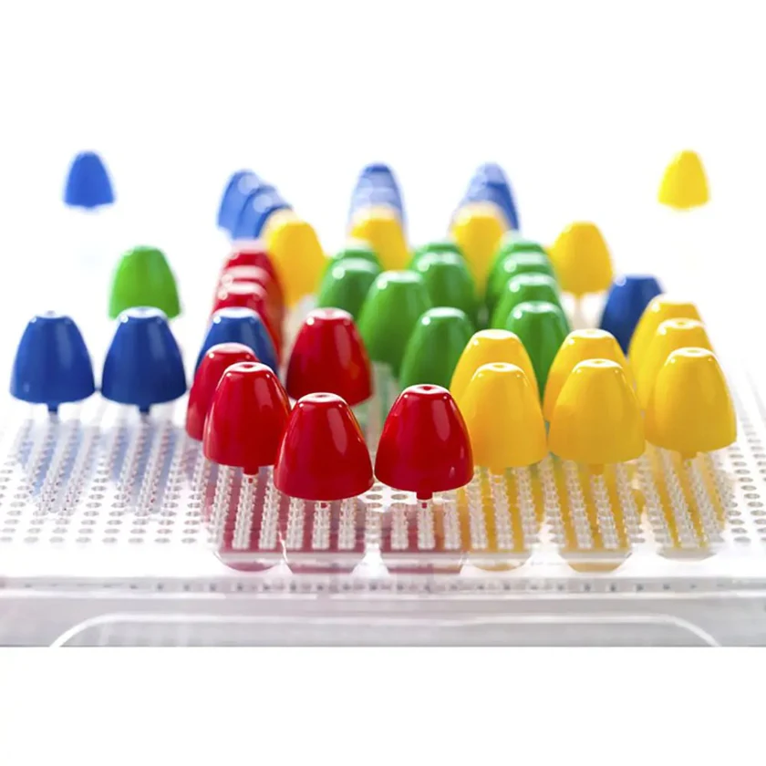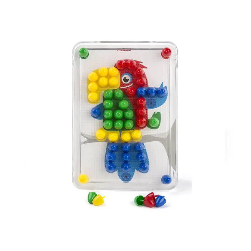 Set sadrži: 100 čavlića u primarnim bojama, ploču i 6 predložaka za slaganje